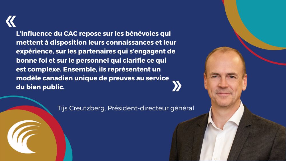 Je suis confiant, grâce à la communauté qui soutient ce travail. L’influence du CAC repose sur les bénévoles qui mettent à disposition leurs connaissances et leur expérience, sur les partenaires qui s’engagent de bonne foi et sur le personnel qui clarifie ce qui est complexe. Ensemble, ils représentent un modèle canadien unique de preuves au service du bien public.
