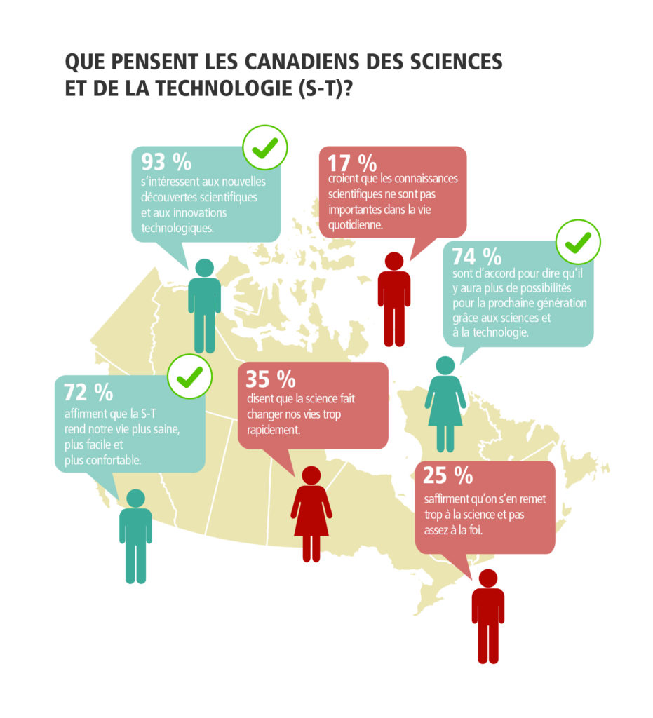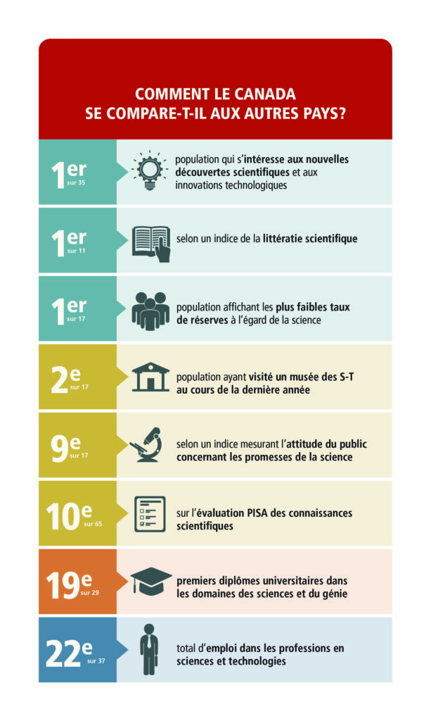 Faisant partie intégrante de la culture et la société canadiennes, la science a des incidences à la fois sur la vie individuelle et la vie sociale. En tant qu’élément moteur de l’économie, elle catalyse l’innovation et suscite la création de nouveaux biens et services. Elle a été à l’origine d’améliorations de l’état de santé et du bien-être des Canadiens, et elle a transformé la façon dont ceux-ci interagissent les uns avec les autres grâce aux nouvelles technologies. De plus, elle est source de divertissement et d’émerveillement pour les gens de tous âges. Bien que les applications de la science et de la technologie soient généralement accueillies d’un œil favorable, elles peuvent aussi causer des débats et controverses. En outre, bon nombre de gens ne possèdent pas les connaissances scientifiques requises pour comprendre ces débats et y prendre part. Certains individus ont par ailleurs des réserves à l’égard de la science et la technologie et de ses effets sur la société. Partout dans le monde, les gouvernements reconnaissent le rôle important que joue la science dans le développement d’une économie innovatrice fondée sur le savoir, mais il est crucial de comprendre la relation complexe et changeante que la société entretient avec la science afin d’assurer que celle-ci continuera d’améliorer et d’enrichir la vie de chacun.